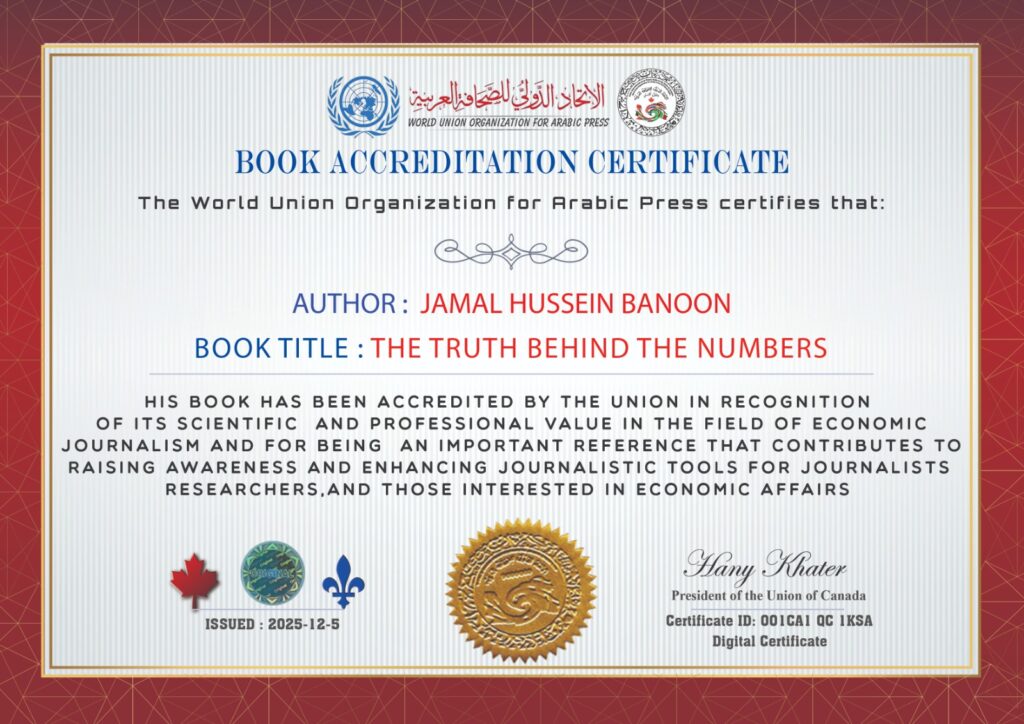 وانطلاقًا من هذا الإدراك العميق لدور المعرفة في بناء صحافة اقتصادية أكثر وعيًا وتأثيرًا، تبنّى الاتحاد الدولي للصحافة العربية – كندا (World Union Organization for Arabic Press – Canada) عبر أحد برامجه الثقافية مبادرة اعتماد الكتاب وتكريم مؤلفه، في خطوة تعكس اهتمام الاتحاد المتواصل بدعم المحتوى الهادف، وتشجيع الإنتاج المعرفي الذي يخدم المجتمع، ويرتقي بمهارات الصحافيين، ويعزز مبادئ الحرية والكرامة وحقوق الإنسان.