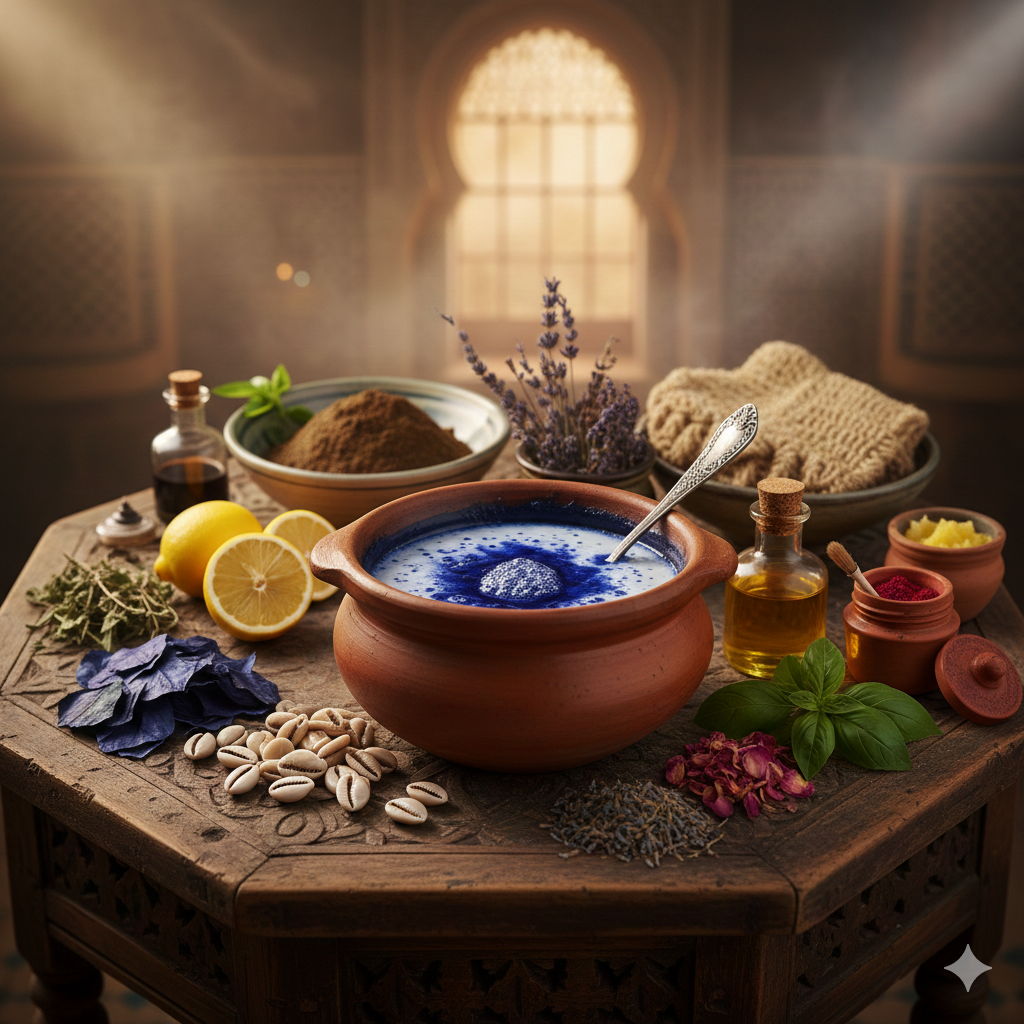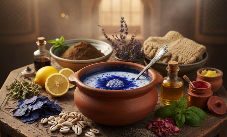 تُعد الطقوس الجمالية المغربية إرثاً غنياً يمتد لقرون، حيث استمدت المرأة المغربية سرّ نضارتها من كنوز الطبيعة الأطلسية والصحراوية. ومن أبرز هذه الوصفات القديمة التي لا تزال تتربع على عرش العناية بالبشرة هي “وصفة النيلة الصحراوية والودعة”، والتي تمثل جزءاً من فلسفة جمالية تعتمد على التناغم بين العناصر الأربعة: الماء، النار (البخار)، التراب، والنبات.
