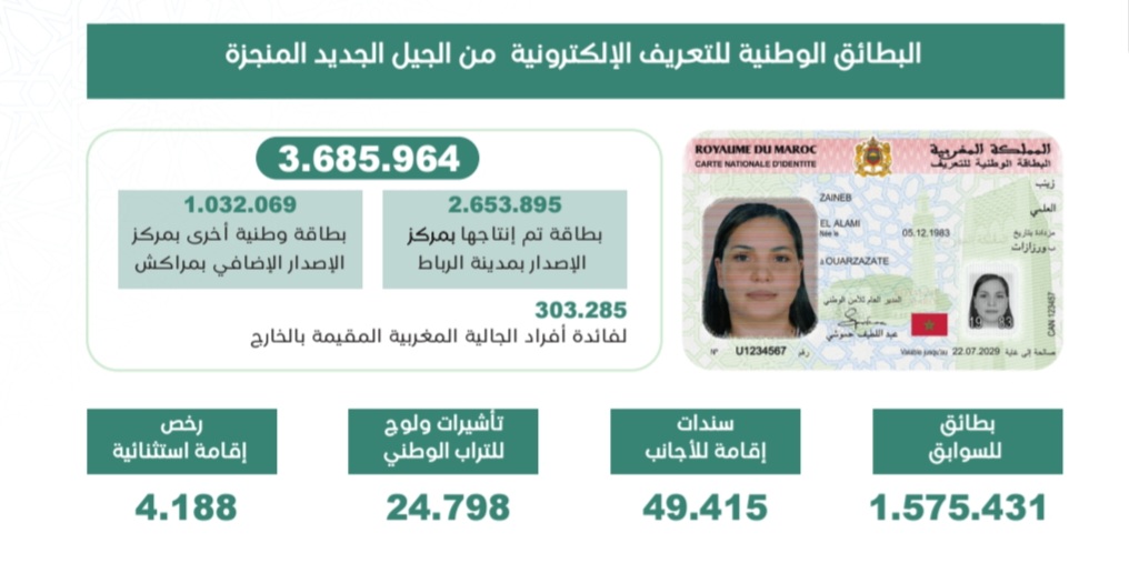 كما تم إنجاز أزيد من 3,6 ملايين بطاقة وطنية للتعريف الإلكترونية من الجيل الجديد، مع تعبئة وحدات متنقلة لتقريب هذه الخدمة من ساكنة المناطق الجبلية والنائية، وتسريع وتيرة إنجاز الوثائق لفائدة الجالية المغربية بالخارج. وجرى تعميم الأنظمة المعلوماتية الخاصة بتدبير القضايا الجنائية وحوادث السير، بما رفع من سرعة المعالجة وجودة الإحصائيات الأمنية.