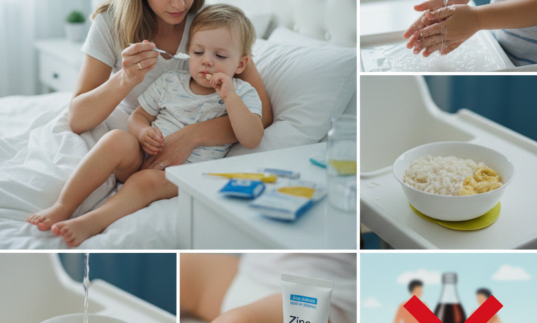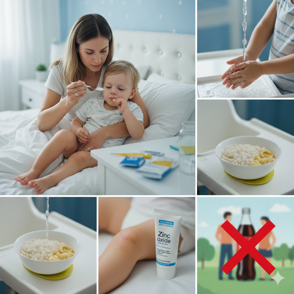 الراحة والترطيب: يحتاج الطفل لراحة تامة، مع ضرورة استخدام كريمات واقية (مثل أكسيد الزنك) لمنع التسلخات الناتجة عن الإسهال المتكرر.