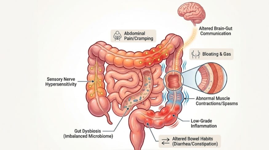 ​وتشير الدراسات السريرية المنشورة في الدوريات الطبية المرموقة مثل “The Lancet” إلى أن القولون العصبي لا يتبع نمطاً واحداً، بل يتشكل في صور سريرية متباينة تشمل الإمساك المزمن أو الإسهال المتكرر أو المزيج بينهما، مدعوماً بانتفاخ بطني مرئي وتشنجات معوية مؤلمة. وتكمن الحقيقة الطبية الصادمة في أن الميكروبيوم المعوي، وهو مجتمع البكتيريا الصديقة في الأمعاء، يلعب دوراً محورياً في هذا الاضطراب؛ إذ أثبتت فحوصات التنوع البيولوجي أن مرضى القولون يعانون من “دسبوزيس” أو اختلال في التوازن البكتيري، مما يؤدي إلى تخمر الأطعمة بشكل غير طبيعي وإنتاج غازات الميثان والهيدروجين بكميات تسبب تمدداً مؤلماً في جدران الأمعاء. كما أن البراهين المخبرية الحديثة بدأت تشير إلى وجود التهابات مجهرية لا تُرى بالعين المجردة خلال التنظير التقليدي، لكنها تظهر تحت المجهر في شكل زيادة في الخلايا البدينة (Mast Cells) القريبة من النهايات العصبية، مما يفسر استمرار الألم حتى في غياب القرح أو الأورام.