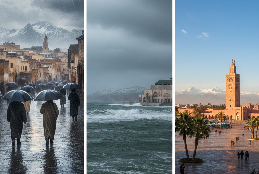 الأمطار: توقعات بهطول زخات مطرية قوية تتراوح بين 30 و 65 ملم في مناطق: طنجة، تطوان، العرائش، القنيطرة، الرباط، سلا، سيدي سليمان، سيدي قاسم، ووزان. كما ستمتد هذه الأمطار لتشمل مناطق سايس (فاس ومكناس) ومرتفعات الريف.
