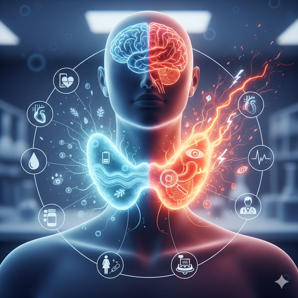 تؤثر الغدة الدرقية بشكل مباشر على الحالة النفسية والكيمياء الدماغية؛ ففي القصور يعاني المريض من “ضبابية الدماغ” وضعف التركيز وفقدان الذاكرة القصير والاكتئاب الشديد، أما في الفرط فتظهر أعراض تشبه نوبات الهلع والارتباك والعصبية المفرطة والأرق. كما تؤثر بشكل كبير على صحة المرأة والخصوبة، فقد يؤدي الاضطراب إلى تأخر الحمل بسبب منع التبويض، وأثناء الحمل تُعد الهرمونات الدرقية ضرورية جداً لتطور دماغ الجنين وجهازه العصبي، لذا يتم تعديل الجرعات الدوائية بدقة شديدة.