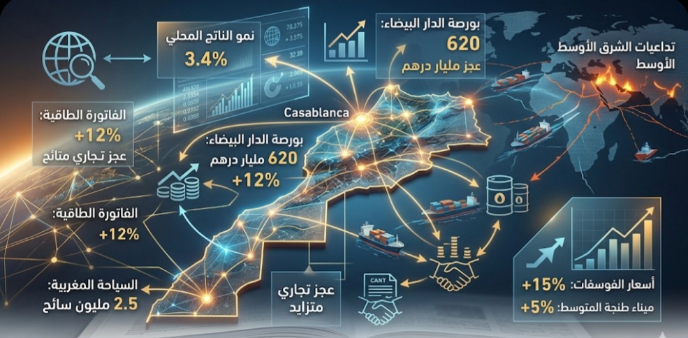 وتكشف البيانات التحليلية لبورصة الدار البيضاء أن المستثمرين بدؤوا في إعادة توزيع محافظهم المالية للتحوط ضد مخاطر الحرب، من خلال زيادة التركيز على الشركات ذات الأصول المادية القوية والتدفقات النقدية المستقرة، مما حافظ على استقرار رسملة البورصة عند مستويات تناهز 620 مليار درهم. ومع استمرار الاضطرابات في مضيق هرمز وتأثيرها على حركة الملاحة الدولية، يبرز ميناء طنجة المتوسط كركيزة استراتيجية في الالتفاف على مسارات التجارة التقليدية، حيث نمت حركة الحاويات بنسبة تناهز 5%، مما يعزز من مداخيل الخدمات اللوجستية الوطنية. إن تداخل الأرقام بين الانتعاش الداخلي والضغط الخارجي يرسم صورة لاقتصاد مغربي يتسم بالذكاء في إدارة الأزمات، حيث يتم استغلال ارتفاع أسعار الفوسفات العالمية – التي قفزت بنسبة 15% نتيجة القلق الدولي من نقص الأسمدة – لتعويض الخسائر في ميزان الأداءات. وفي الختام، يظل الاقتصاد المغربي في عام 2026 رهيناً بمدى طول أمد الصراع الإقليمي وتأثيره على أسواق الطاقة العالمية، إلا أن القاعدة الهيكلية المتينة والسياسات المالية الاستباقية توفر شبكة أمان كافية لامتصاص الصدمات وحماية وتيرة التنمية المستدامة من الانهيار تحت وطأة الظروف الجيوسياسية المتقلبة.
