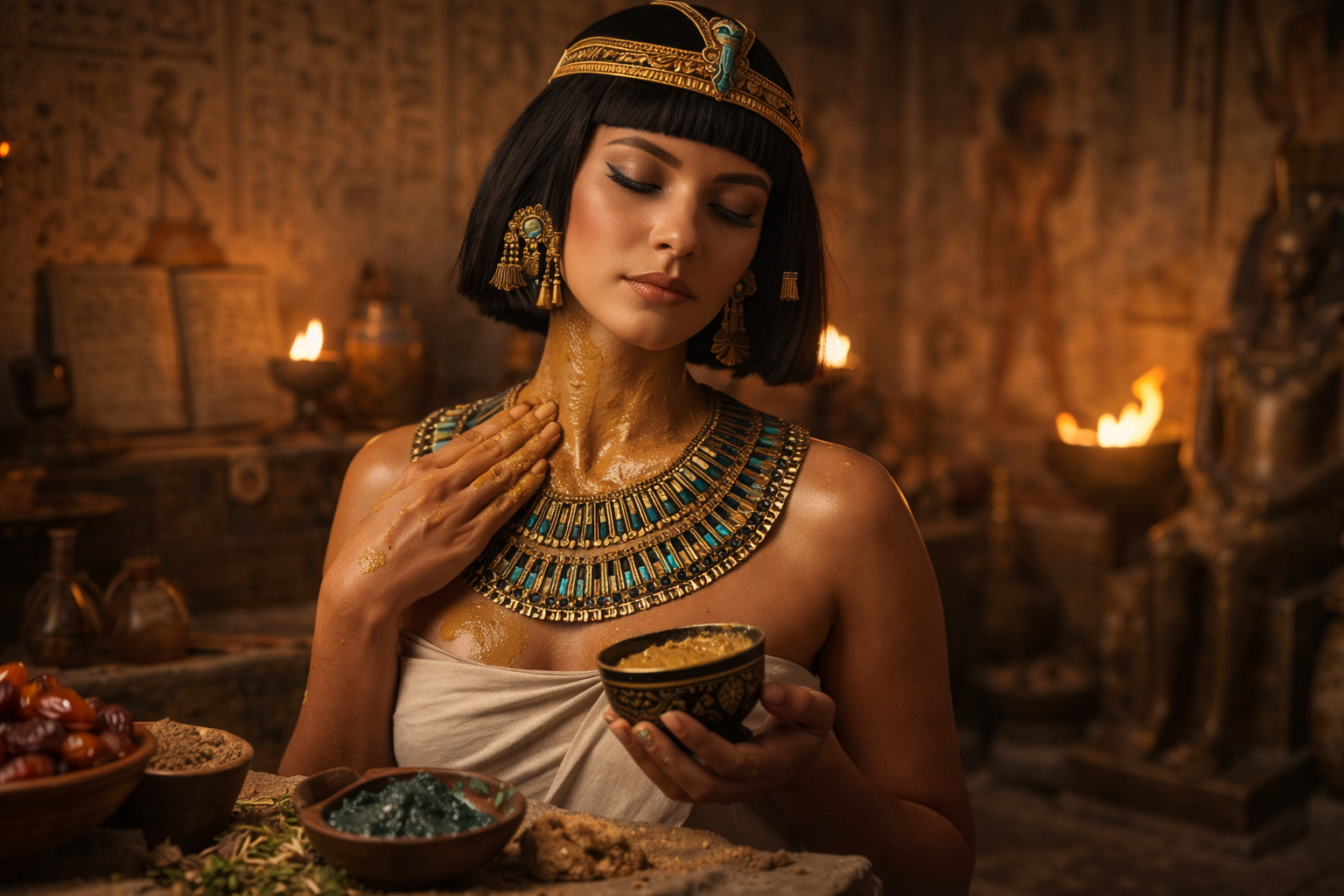الأكثر إثارة أن هذه الوصفة كانت تُرفق أحياناً بنظام غذائي مؤقت، يقوم على الامتناع عن اللحوم الثقيلة والتركيز على الخبز المصنوع من الشعير والعسل، لأن الفراعنة كانوا يرون أن الجمال لا يثبت على جسد “مُثقل من الداخل”. هذا الربط بين التغذية والمظهر الخارجي يظهر وعياً متقدماً جداً بوحدة الجسد.