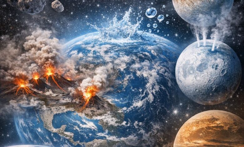 إلى جانب هذا العامل الداخلي، يرجّح العلماء أن جزءًا مهمًا من ماء الأرض جاء من الفضاء الخارجي. فقد تعرّض الكوكب في بداياته لاصطدامات متكررة مع المذنبات والنيازك الغنية بالجليد. هذه الأجرام السماوية ساهمت في تزويد الأرض بكميات إضافية من الماء، مما عزّز مخزونها المائي وساعد على استقراره فوق السطح.