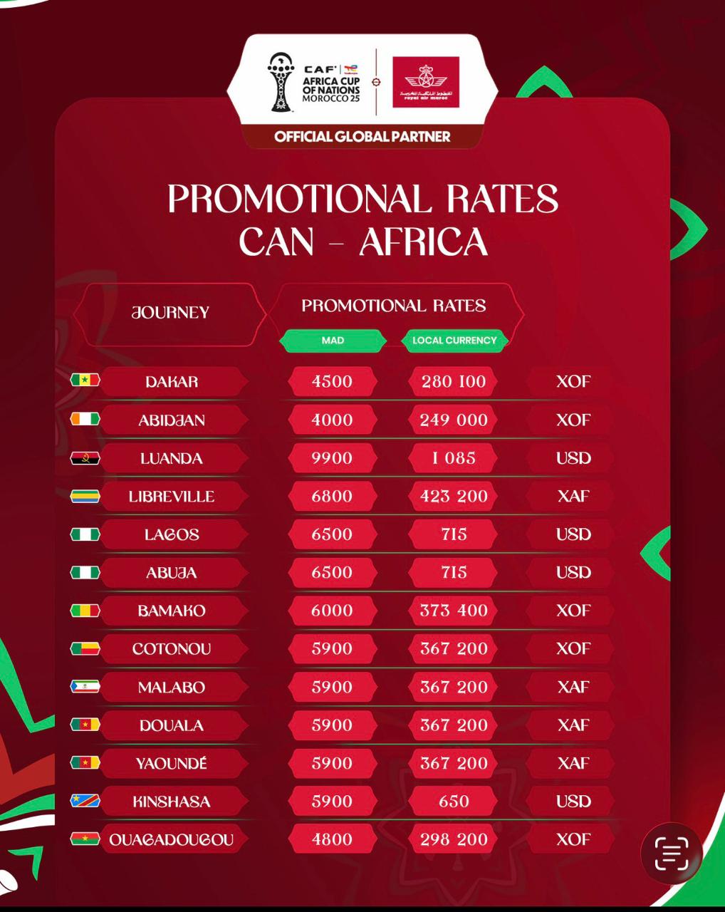 وتشمل هذه العروض أسعاراً تفضيلية حسب بلد الانطلاق، بهدف تمكين أكبر عدد من الجماهير الإفريقية من السفر إلى المغرب ومواكبة هذا الحدث الرياضي القاري في أفضل الظروف.